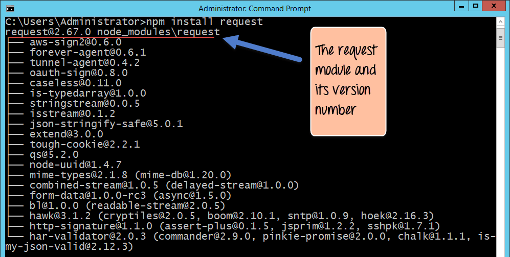 In the above snapshot, you can see that the 'request' module along with the version number 2.67.0 was downloaded and installed.