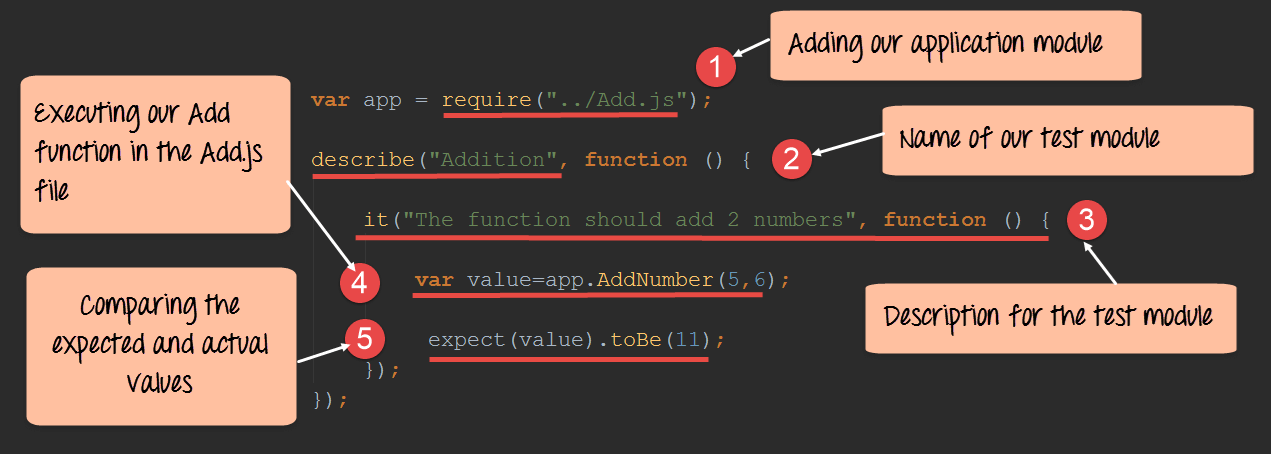 In our example below, we are going to define a module which adds 2 numbers which need to be tested. We will then define a separate code file with the test code and then use jasmine to test the Add function accordingly.