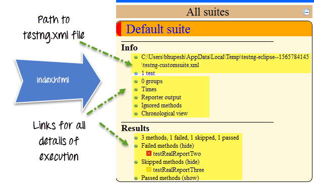 Index.html: This is the complete report of current execution which contains information like an error, groups, time, reporter logs, testng XML files.