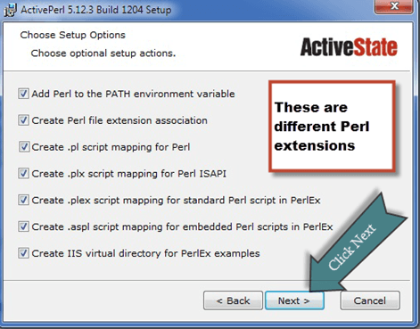 Step 4: These are different types of Perl extensions that can be used for Perl. Mostly we will be using .Pl, .Plx and .Pm for Perl. Perl modules basically use .Pm as their file extension to refer to a library file. Select all the options and click on the Next button.