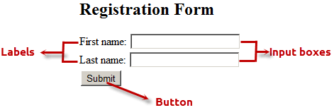The form is defined using the <form>...</form> tags and GUI items are defined using form elements such as input.