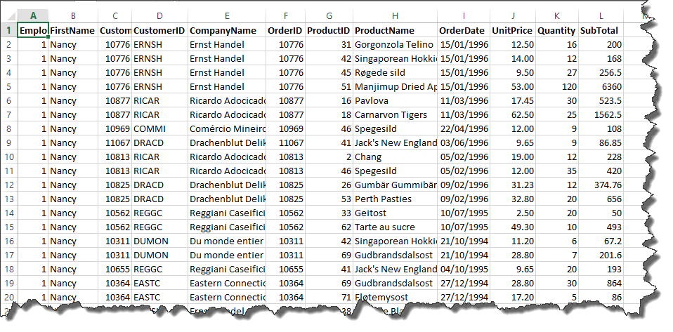 As you can see from the above image, our spreadsheet contains a lot of data. Let's say we want to create a summary of customers, group all of their orders by product, and show the quantities, unit price and subtotals for all the transactions.