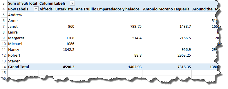 A two-dimensional pivot table is a table that has fields on both rows and columns. Let's say we want to list employee names as rows and use columns to represent customer names and fill in the cells with the total sales.