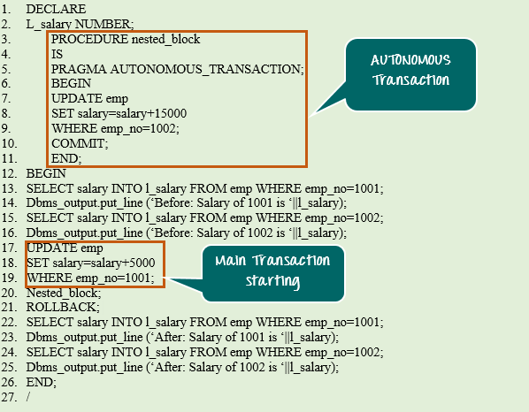 DECLARE PRAGMA AUTONOMOUS_TRANSACTION; . BEGIN <executin_part> [COMMIT|ROLLBACK] END; /