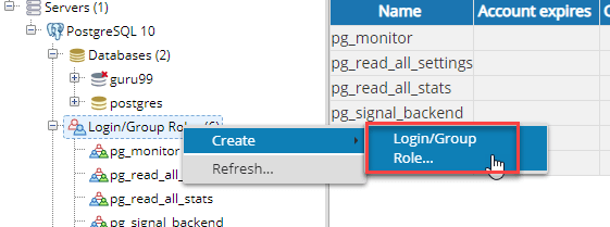 Step 1) Right click on Login/Group Role -> Create -> Click on Login/Group Roleā¦