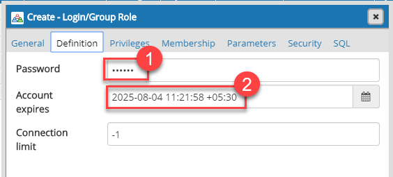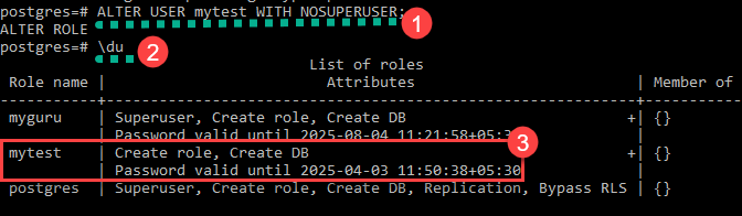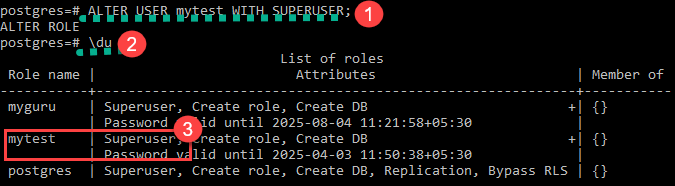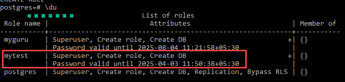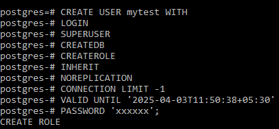 CREATE USER mytest WITH LOGIN SUPERUSER CREATEDB CREATEROLE INHERIT NOREPLICATION CONNECTION LIMIT -1 VALID UNTIL '2025-04-03T11:50:38+05:30' PASSWORD '123456';