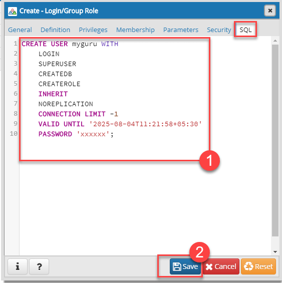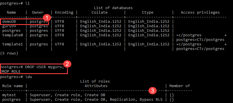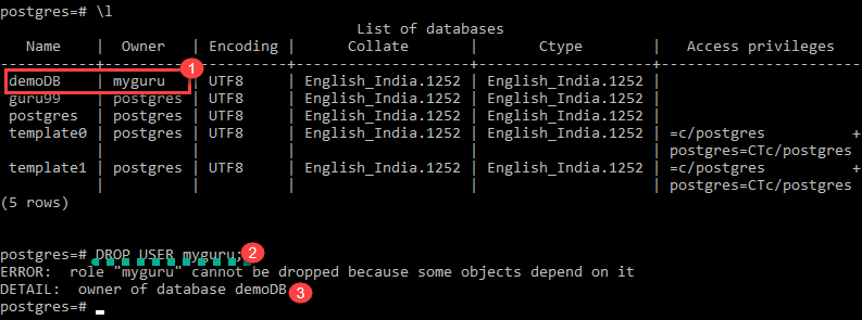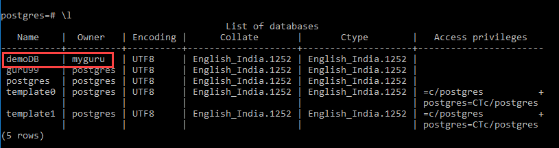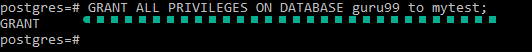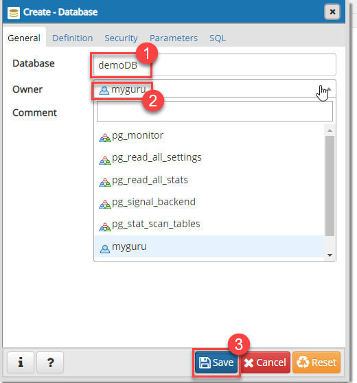 Step 7) Create a Database and assign owner myguru to it as shown in below create user Postgres example