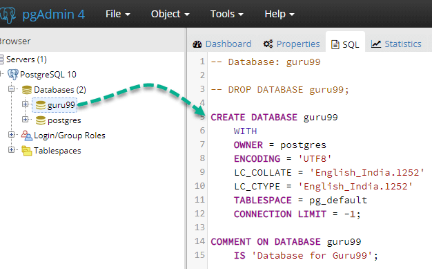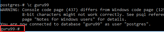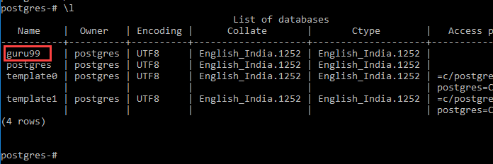 | Ctype | It specifies the character classification for the new database. It affects the categorization, e.g., digit, lower and upper. |