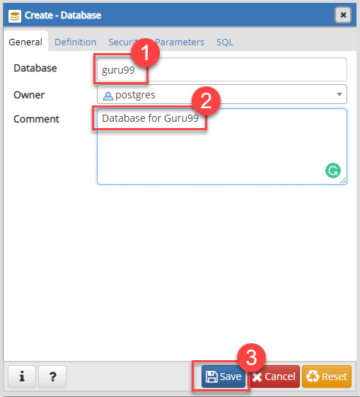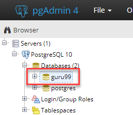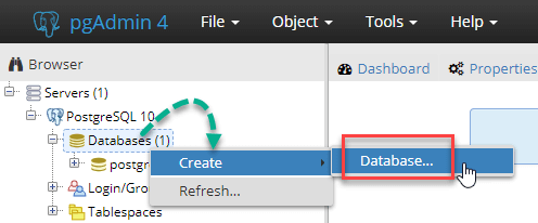 Step 1) In the Object Tree, right click and select create a database to Postgres create database