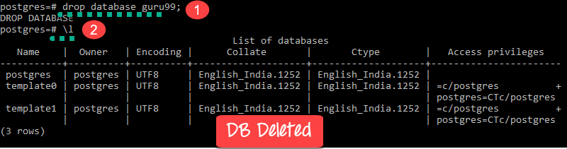 The DROP DATABASE statement removes all the catalog entries and data directory permanently from the PostgreSQL environment. So, you should be extra cautious when performing this operation.