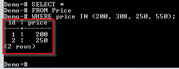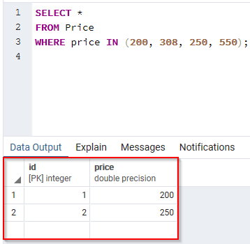 We have created a list with 4 numeric values. We are checking whether we can match any of these values with the values contained in the price column of the Price table. Two values were matched, and their details were returned.