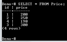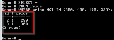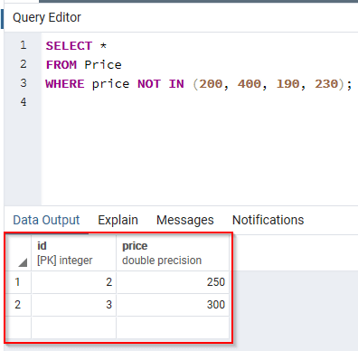 We have created a list with 4 numerical values. We are checking the price column of the Price table for values that are not part of the list. Two values, 250 and 300, were not found. Hence their details have been returned.