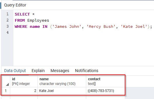 We have a list of three names. We are searching for whether we can find any of these names in the name column of the Employees table. The Kate Joel was matched to one of the table's records, and its details were returned.