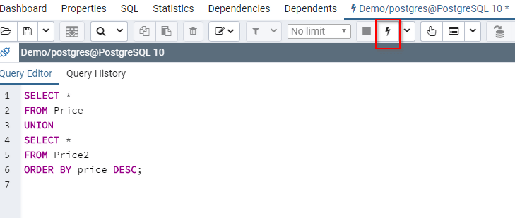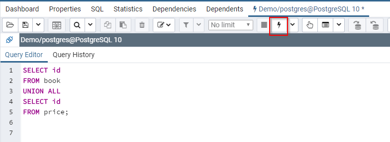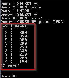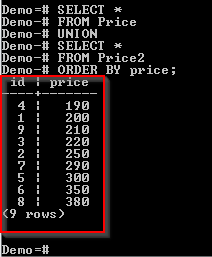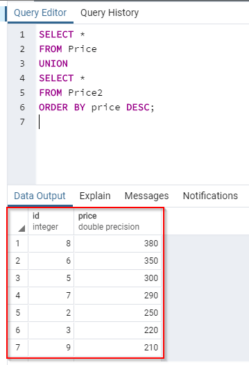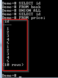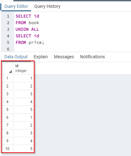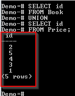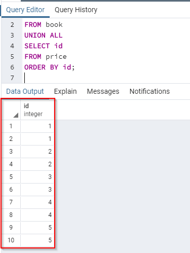 The id column appears in both the Book and the Price tables. However, it appears only once in the result. The reason is that PostgreSQL UNION operator doesn't return duplicates.