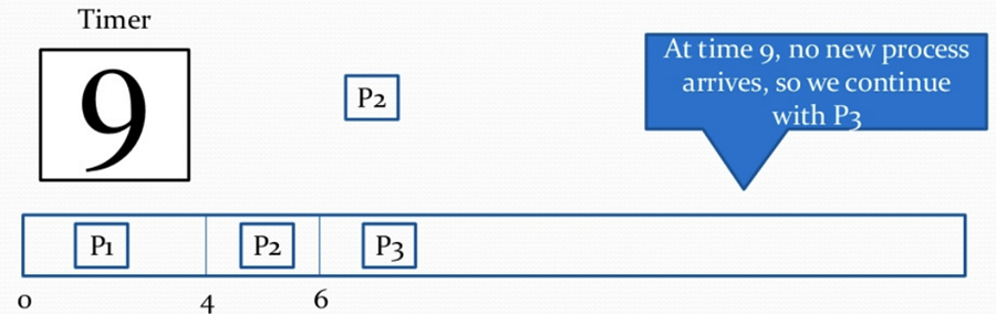 Step 9) At time= 9, no new process comes so we can continue with P3.