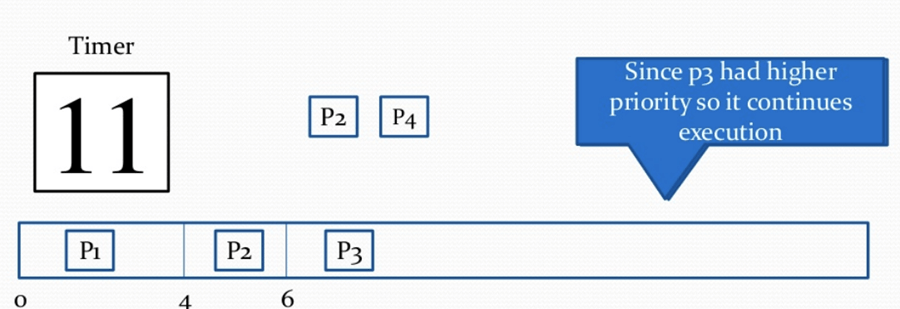 Step 11) At time=11, P4 arrives with priority 4. P3 has higher priority, so it continues its execution.