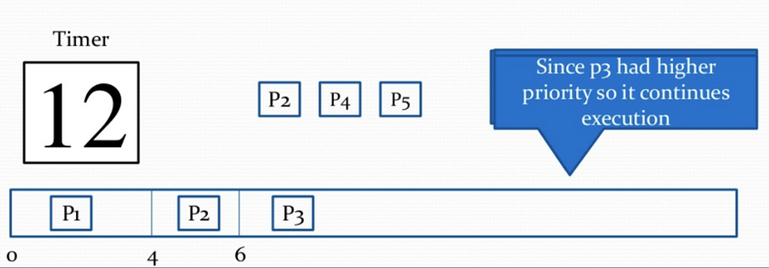 Step 12) At time=12, P5 arrives. P3 has higher priority, so it continues execution.