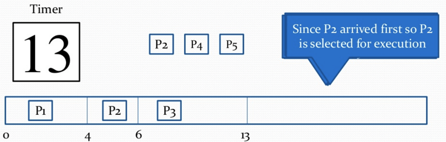 Step 13) At time=13, P3 completes execution. We have P2,P4,P5 in ready queue. P2 and P5 have equal priority. Arrival time of P2 is before P5. So P2 starts execution.