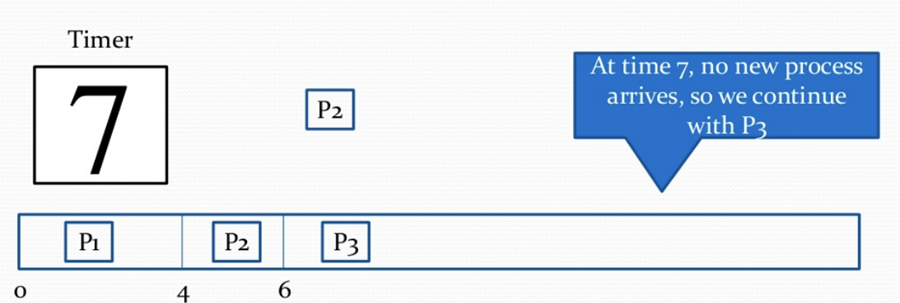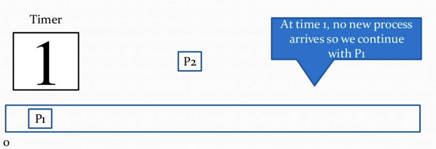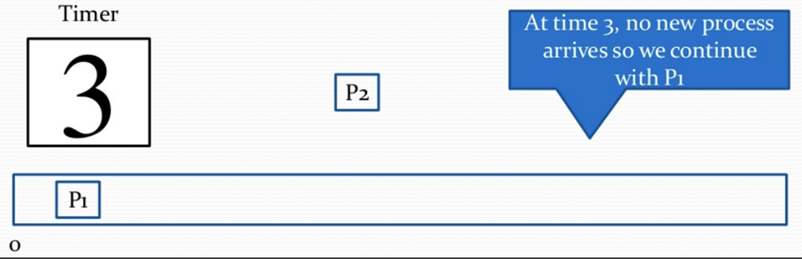 Step 3) At time 3, no new process arrives so you can continue with P1. P2 process still in the waiting queue.