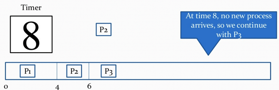 Step 8) At time= 8, no new process arrives, so we can continue with P3.