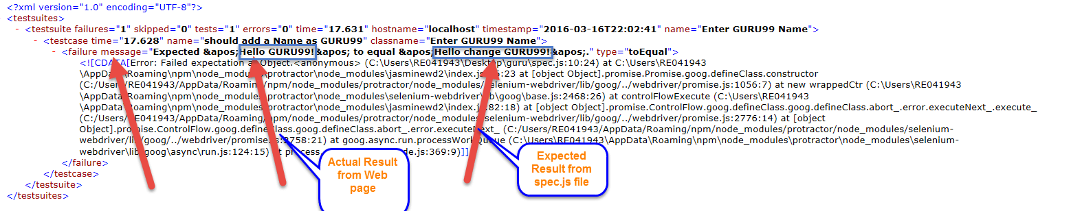 Step 6) Open the XML and verify the result. The failure message is shown in the result file as our Test Case is failed. The Test case is failed as because of the Expected Result from "spec.js" is not matched with the Actual result from a Web page