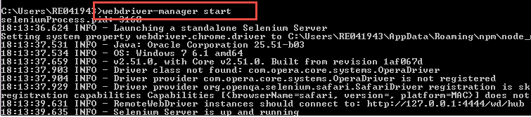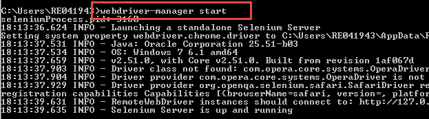 Step 2) Make sure selenium web driver manager is up and running. For that give the command as "webdriver-manager start" and hit Enter.