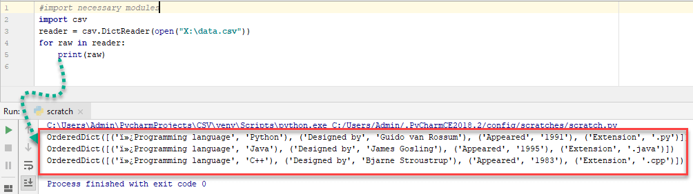 OrderedDict([('Programming language', 'C++'), ('Designed by', ' Bjarne Stroustrup'), (' Appeared', ' 1985'), (' Extension', ' .cpp')])And this way to read data from CSV file is much easier than earlier method. However, this is not isn't the best way to read data.