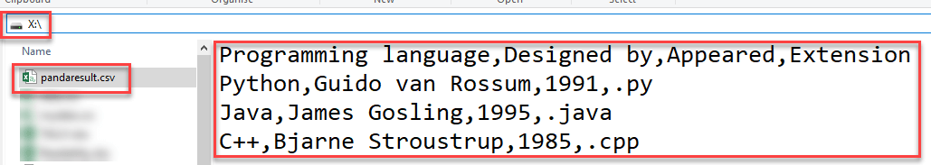 export_csv = df.to_csv (r'X:\pandaresult.csv', index = None, header=True) # here you have to write path, where result file will be stored