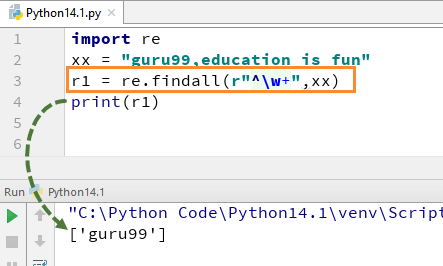 Here we will see a Python RegEx Example of how we can use w+ and ^ expression in our code. We cover the function re.findall() in Python, later in this tutorial but for a while we simply focus on \w+ and \^ expression.
