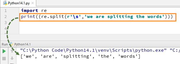 To understand how this RegEx in Python works, we begin with a simple Python RegEx Example of a split function. In the example, we have split each word using the "re.split" function and at the same time we have used expression \s that allows to parse each word in the string separately.