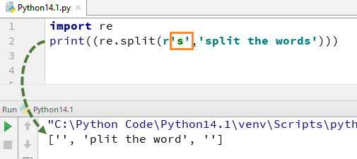 Now, let see what happens if you remove "\" from s. There is no 's' alphabet in the output, this is because we have removed '\' from the string, and it evaluates "s" as a regular character and thus split the words wherever it finds "s" in the string.