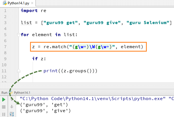 For example, consider the following code of Python re.match() function. The expression "w+" and "\W" will match the words starting with letter 'g' and thereafter, anything which is not started with 'g' is not identified. To check match for each element in the list or string, we run the forloop in this Python re.match() Example.