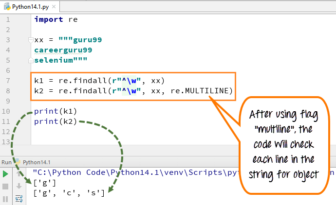 import re xx = """gtupapers careergtupapers selenium""" k1 = re.findall(r"^\w", xx) k2 = re.findall(r"^\w", xx, re.MULTILINE) print(k1) print(k2)