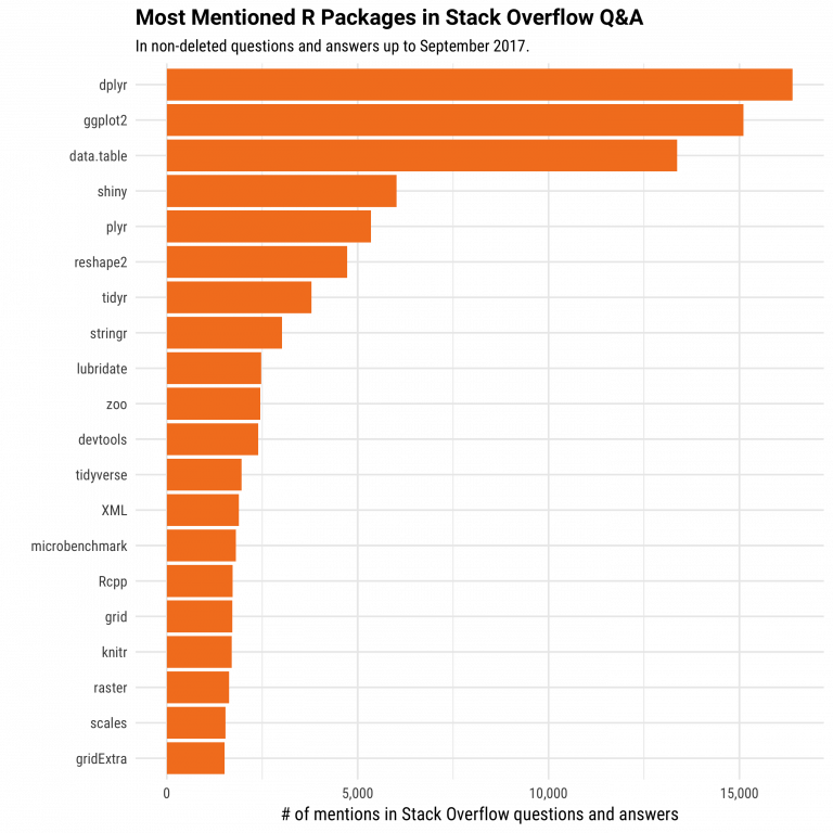 The primary uses of R is and will always be, statistic, visualization, and machine learning. The picture below shows which R package got the most questions in Stack Overflow. In the top 10, most of them are related to the workflow of a data scientist: data preparation and communicate the results.