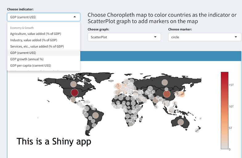 Rstudio has a great tool to create an App easily. Below is an example of app with the World Bank data.