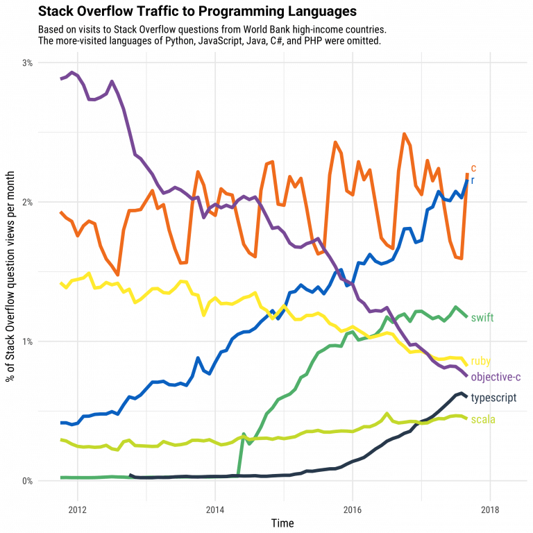 Stack Overflow is a big community for programming languages. If you have a coding issue or need to understand a model, Stack Overflow is here to help. Over the year, the percentage of question-views has increased sharply for R compared to the other languages. This trend is of course highly correlated with the booming age of data science but, it reflects the demand of R language for data science.