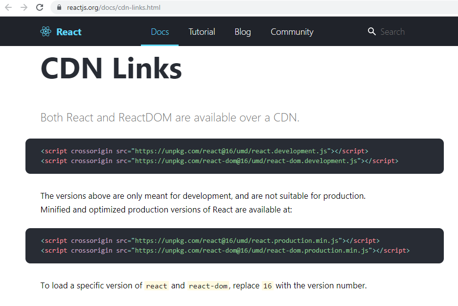 <script crossorigin src="https://unpkg.com/react@version/umd/react.production.min.js"></script> <script crossorigin src="https://unpkg.com/react-dom@version/umd/react-dom.production.min.js"></script>