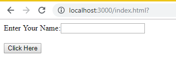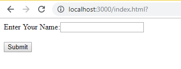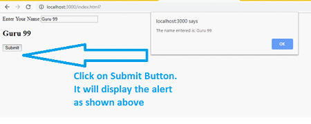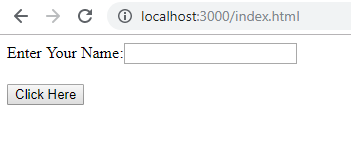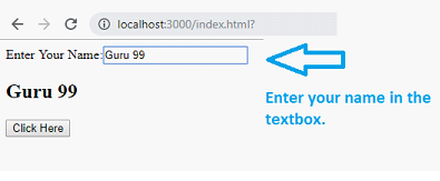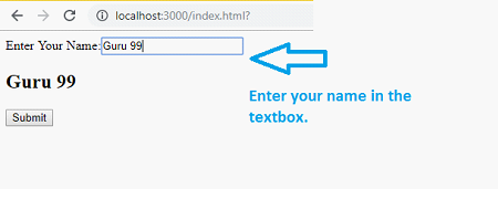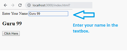 We have used events onChange and onClick on the textbox and submit button. When the user enters inside the textbox the onChange event is called, and the name field inside state object state is updated as shown below:
