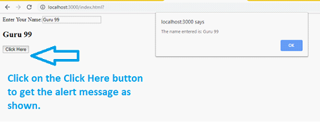 We have used events onChange and onClick on the textbox and button. When the user enters inside the textbox the onChange event is called, and the name field inside state object state is updated as shown below: