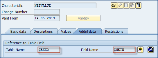 Step 2) Assigning fields to a characteristic on the additional data tab. We are assigning field CEKKO-GNETW to the characteristic, because that field is a purchase document value.