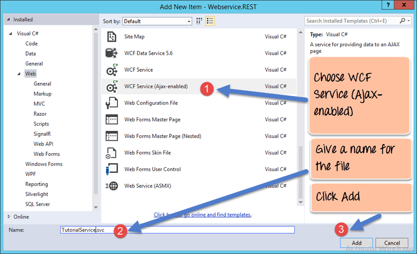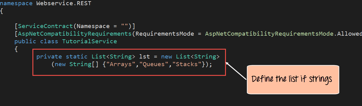 Step 5) The next step in this RESTful API tutorial is to add our code for implementation. All of the below-mentioned code has to be written in the TutorialService.svc file