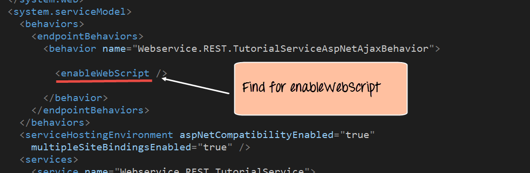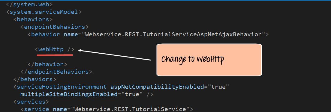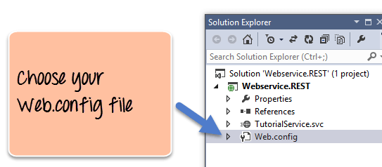 Step 4) The next step is to actually make a configuration change to enable this project to complete work with RESTful web services. This requires to make a change to the file called Web.config. This file appears in the same window as the Webservice project file. The file Web.config contains all configurations that make the web application work as it should. The change being made actually allows the application to send and receive data as a pure RESTful web service.