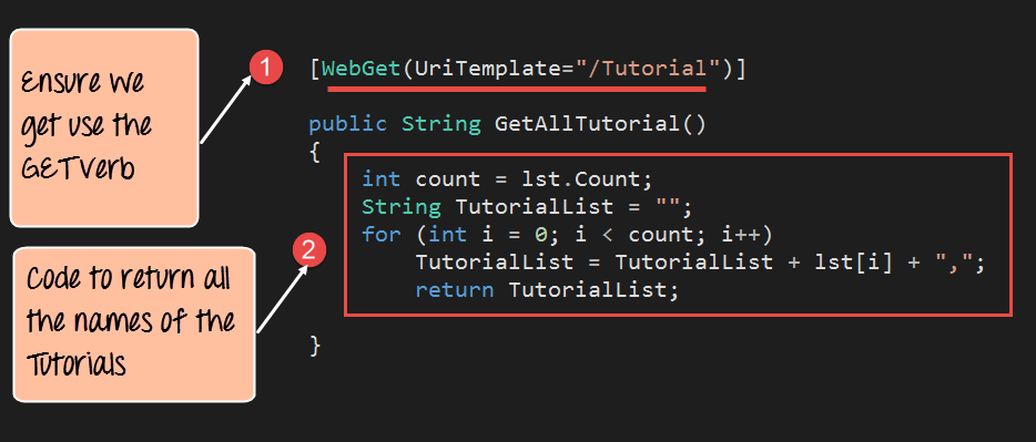 Step 6) Next we will define the code for our GET method. This code will also reside in the same TutorialService.svc file. This code will run whenever we call the service from our browser.