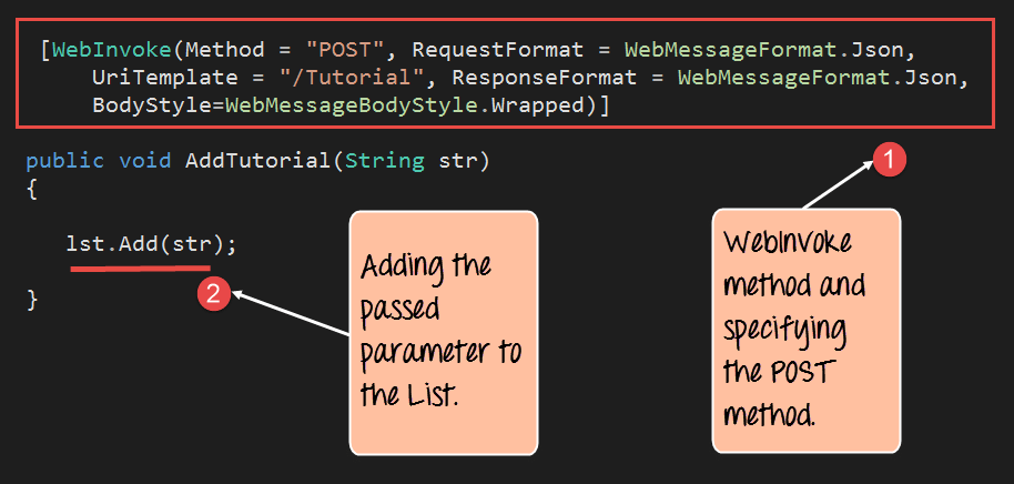 Step 8) The next step is to write up the code for our POST method. This method will be invoked whenever we want to add a string value to our list of Tutorials via the POST method. For example, if you wanted to add the Tutorial name of "Software Testing" then you would need to use the POST method.