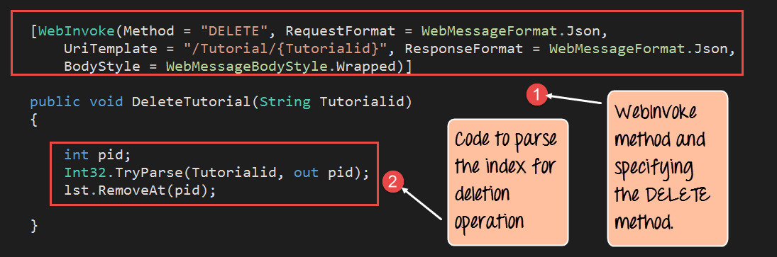 Step 9) Finally we are going to add our method to handle the DELETE operation. This method will be invoked whenever we want to delete an existing string value from our list of Tutorials via the DELETE method.