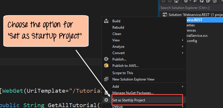 Step 2) Choose the menu option 'Set as StartUp Project'. This will ensure that this project is run when Visual Studio runs the entire solution