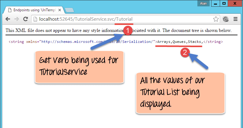 When the project is run, you can browse to your TutorialService.svc/Tutorial section, and you will get the below output.