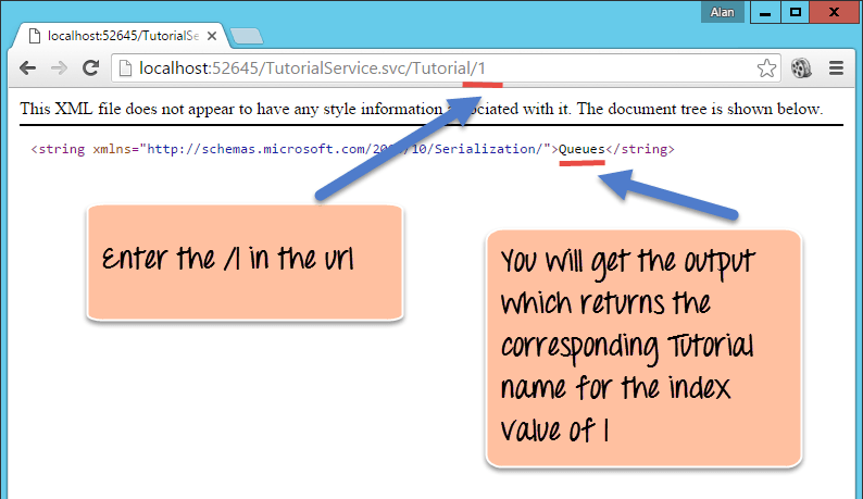 Now you will see the output of Queues which actually corresponds to the number 1 in our list of Tutorial Strings. This means that the 'GetTutorialbyID' method is now being invoked from our Webservice. It also shows that the value of 1 is being passed successfully via the browser to our web service and to our method and that is why we are getting the correct corresponding value of "Queues" in the browser.
