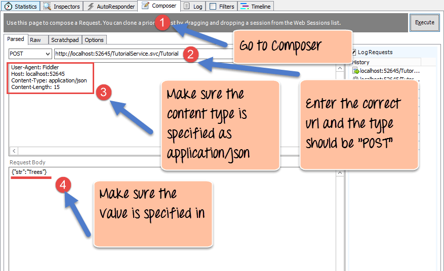 Finally, just click the Execute button in fiddler. This will send a request to the web service to POST the data "Trees" to our web service.