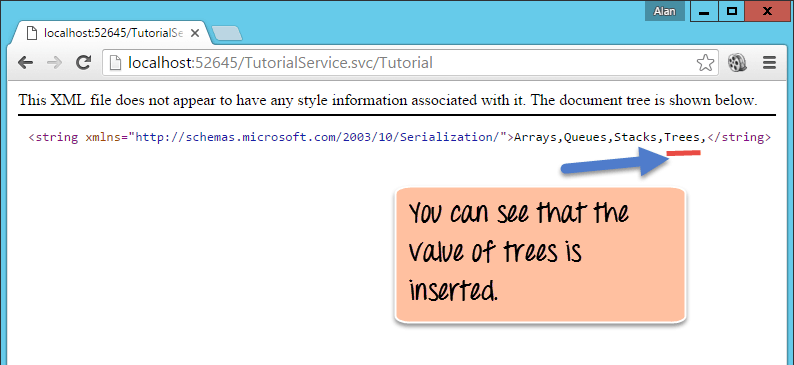 Now, when we browse to the Tutorial URL to show all the strings in our Tutorial list, you will now see the value of "Trees" is also present. This shows that the POST request to the web service was successfully executed and that it was successfully added to our Tutorial List.